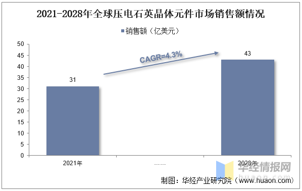 从全球市场规模来看,受益于滤波器市场不断增长,全球压电石英晶体元件市场销售额保持稳定增长态势。据统计,2021年全球压电石英晶体元件市场销售额达到31亿美元,预计2028年将达到43亿美元,CAGR将达到为4.3%。