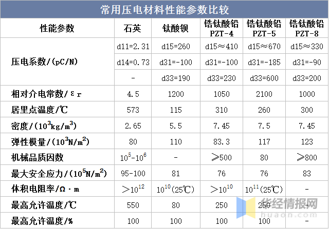 常用压电材料性能参数比较