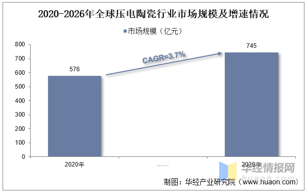 压电陶瓷是一种重要的换能材料,其机电耦合性能优良,在电子信息、机电换能、自动控制、微机电系统、生物医学仪器中广泛应用。从压电陶瓷市场现状来看,根据相关数据统计,,2020年全球压电陶瓷技术市场规模达到了576亿元,预计2026年将达到745亿元,年复合增长率CAGR为3.7%。