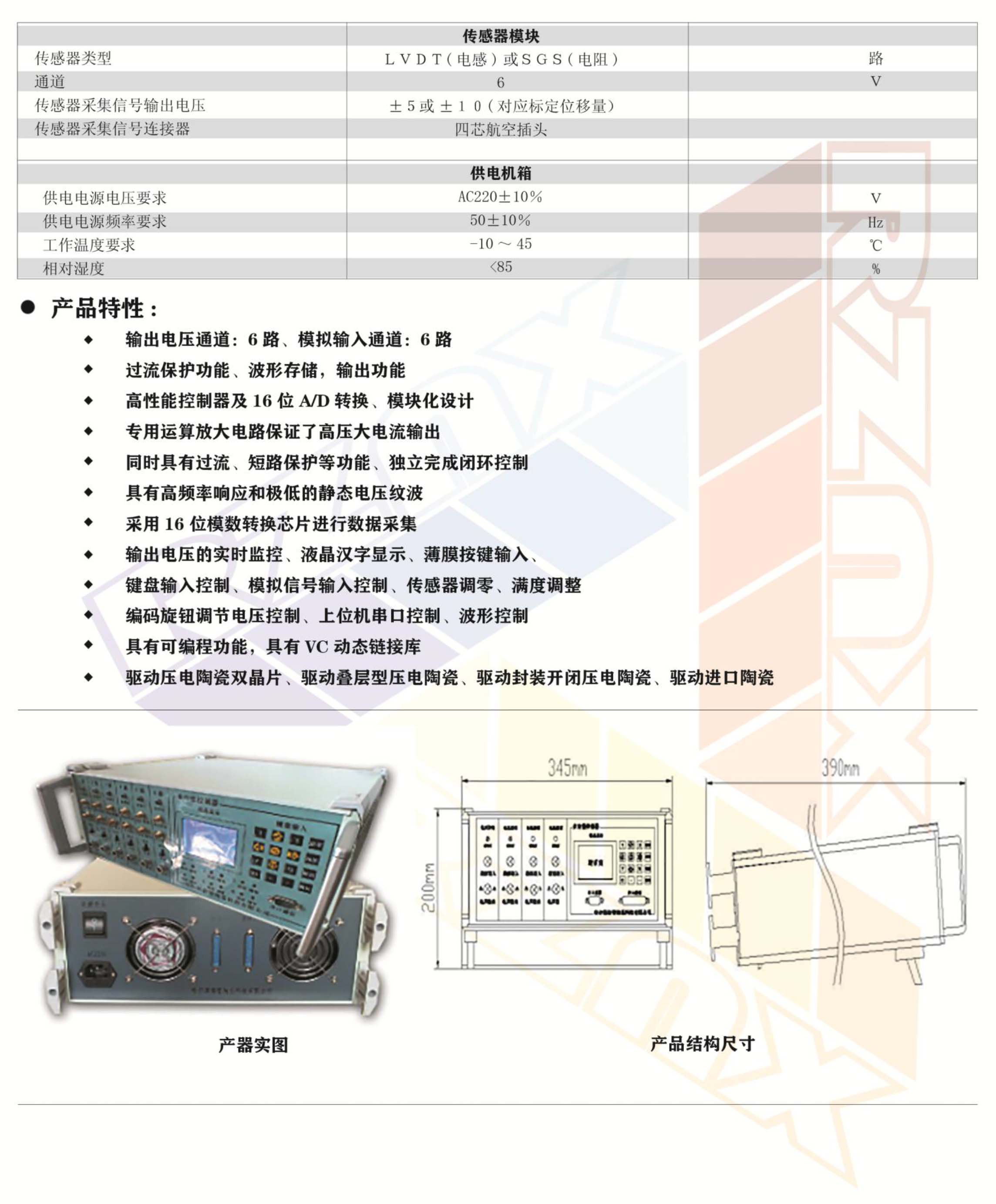 ◆ 采用 16 位模数转换芯片进行数据采集 输出电压的实时监控、液晶汉字显示、薄膜按键输入、键盘输入控制、模拟信号输入控制、传感器调零、满度调整 编码旋钮调节电压控制、上位机串口控制 、波形控制 具有可编程功能,具有VC动态链接库 驱动压电陶瓷双晶片、驱动叠层型压电陶瓷、驱动封装开闭压电陶瓷、驱动进口陶瓷